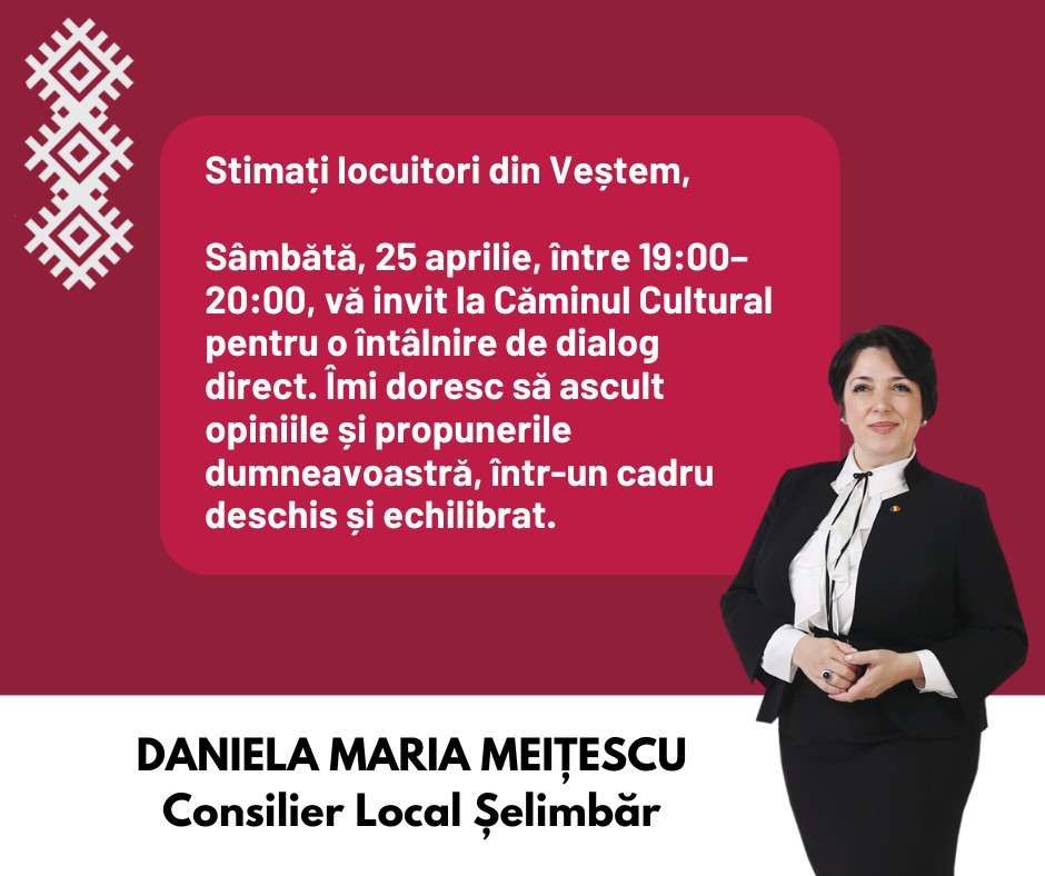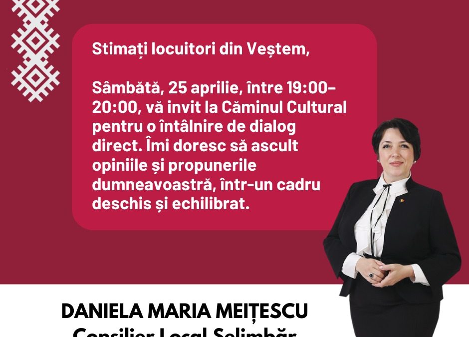 Tot pe 25 aprilie 2026, are loc întâlnirea dedicată locuitorilor din Veștem, un moment important pentru a discuta despre provocările și oportunitățile localității.